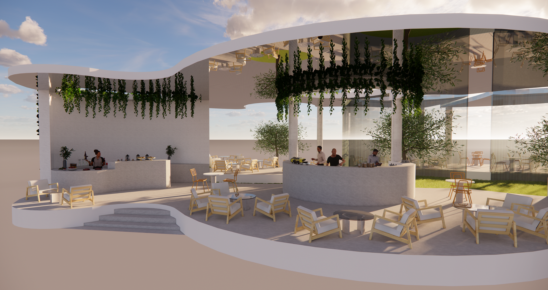 LaPrem Cafe was a renovation project I undertook during my internship at AlHazm Mall. Tasked with redesigning the cafe, my objective was to create an open space that exuded modernity and appealed to a younger demographic surrounded by the olive trees in the space. Additionally, considering its proximity to a gym, I incorporated a juice bar as per the client's request.